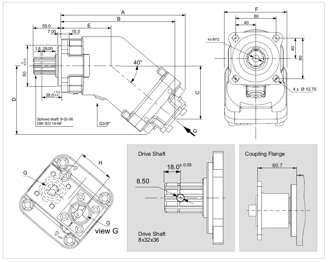 2PBA系列斜軸柱塞泵,采用40度斜軸設計,排量12cc-108cc,最高壓力可達400bar,ISO法蘭連接,花鍵8×32×36 DIN ISO 14-NF。具體參數及尺寸如下: