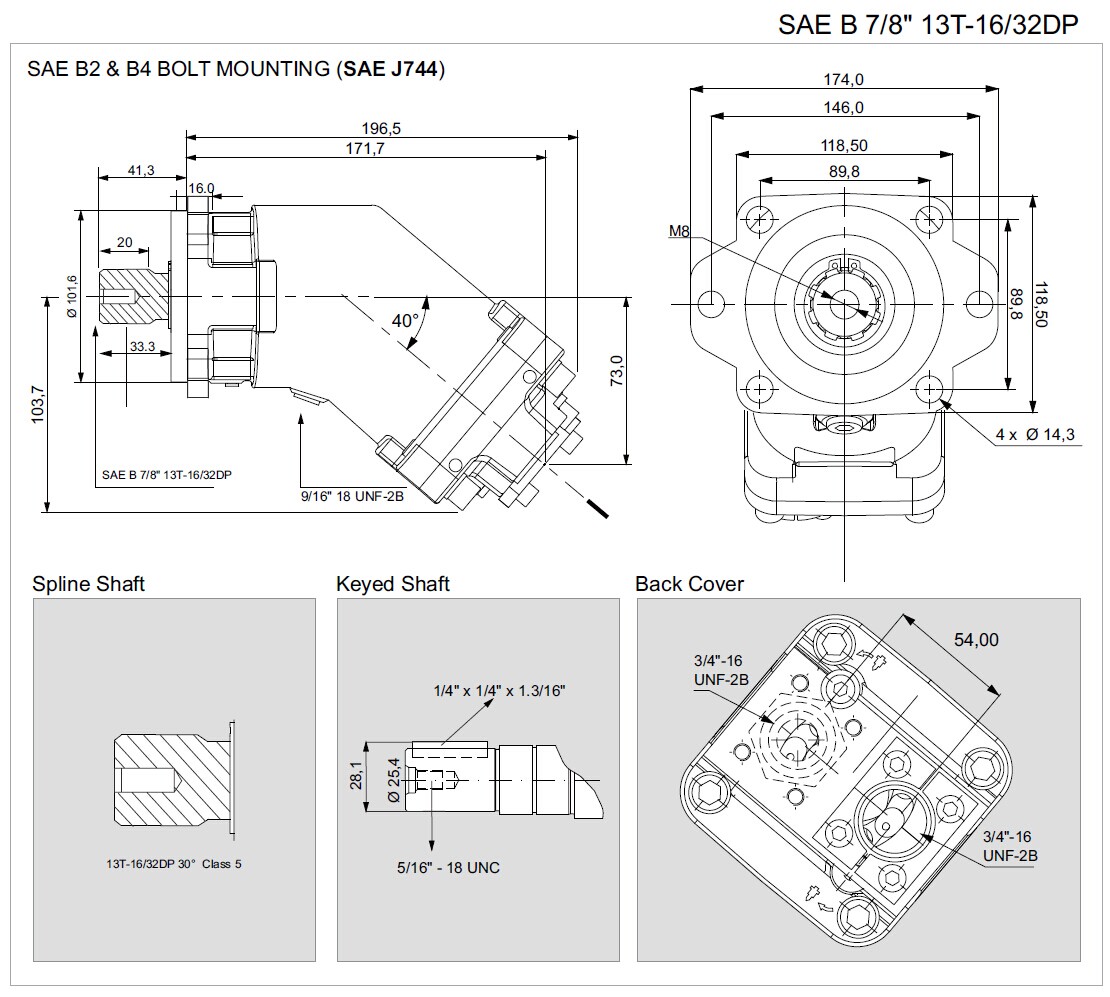 BFPB系列斜軸柱塞泵,采用40度斜軸設計,排量12cc-108cc,最高壓力可達400bar,SAE法蘭連接。具體參數及尺寸如下: